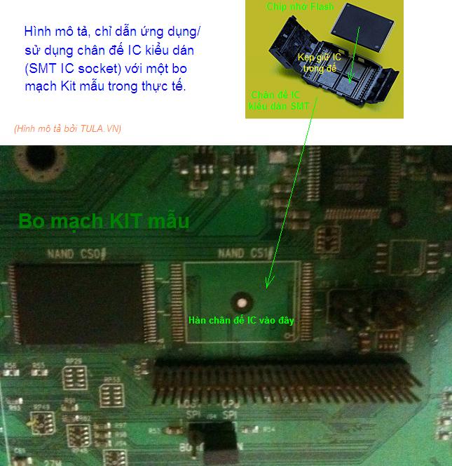 Bo mạch phát triển sản phẩm mới chẳng hạn, trên đó có 01 chip nhớ Flash memory hoặc MCU kiểu chân SMT (SMD devices, SMT package). Thông thường bạn có thể dùng emulator để tải dữ liệu mã trình mô phỏng hoạt động cho Kit phát triển hoặc có một mã trình loader trên chip nhớ Flash/ MCU này rồi để thực hiện tải mã trình cho chip chạy thử trong quá trình phát triển phần mềm nhúng cho hệ thống trên nền KIT đó; Nhưng đôi khi bạn bị hỏng, lỗi không thực hiện được theo 2 cách thức trên hoặc nhiều người cần dùng KIT đó, hay có nhu cầu copy dữ liệu cho một con chip nhớ Flash/ MCU mới hoàn toàn để thử nghiệm ở mạch mẫu (nên nhớ bạn chỉ có một vài mạch mẫu hoặc chỉ 1 KIT gốc rất hiếm hoi này) nhằm xác thực phần mềm nhúng mà mình đang phát triển hoặc thiết kế phần cứng, thì đó là lúc bạn nên dùng chân đế IC kiểu SMT này. Nó sẽ giúp bạn không phải hàn đi hàn lại nhiều lần con chip SMD (Flash, MCU) của mình lên bo mạch để tránh hỏng lỗi chip lẫn bo mạch và thời gian phát triển, kiểm tra khác. Bạn sẽ thấy bức xúc thế nào khi mà chỉ có 1 mẫu hoặc KIT phát triển dùng được mà lại có nhiều người cùng cần dùng nó => Nhóm làm phần mềm không thể phải chờ đến khi có bo phần cứng mới (mẫu khác) được mà phải tiến hành song song ngay cả khi chưa có mẫu phần cứng mới => Dùng chân đế IC làm một giải pháp cho vấn đề.
